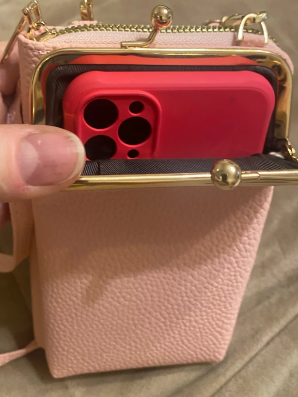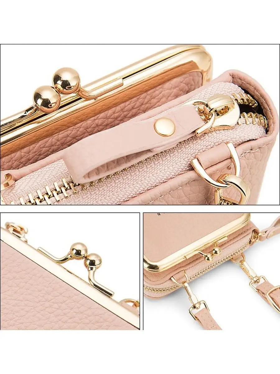 Хороший кошелёк-сумка. Самое необходимое входит, карты, паспорт, права, ключи, помада в кошелёк, телефон (самунг А33 ) в передний карман входит отлично (еще и место остается). А больше ничего и не нужно, например, когда гуляешь по торговому центру, парку и тд, руки свободные, сумка невесомая, лёгкость и ничего не мешает! Очень удобно, стенка отгибается и телефон доставать и убирать одно удовольствие! Ремешок тоненький, как раз для такой изящной, маленькой сумочки. Структура тактильно приятная, мягкая, приятно прикасаться, внешне очень похожа на натуральную кожу. Цвет голубой приятный, очень подходит под голубые джинсы..